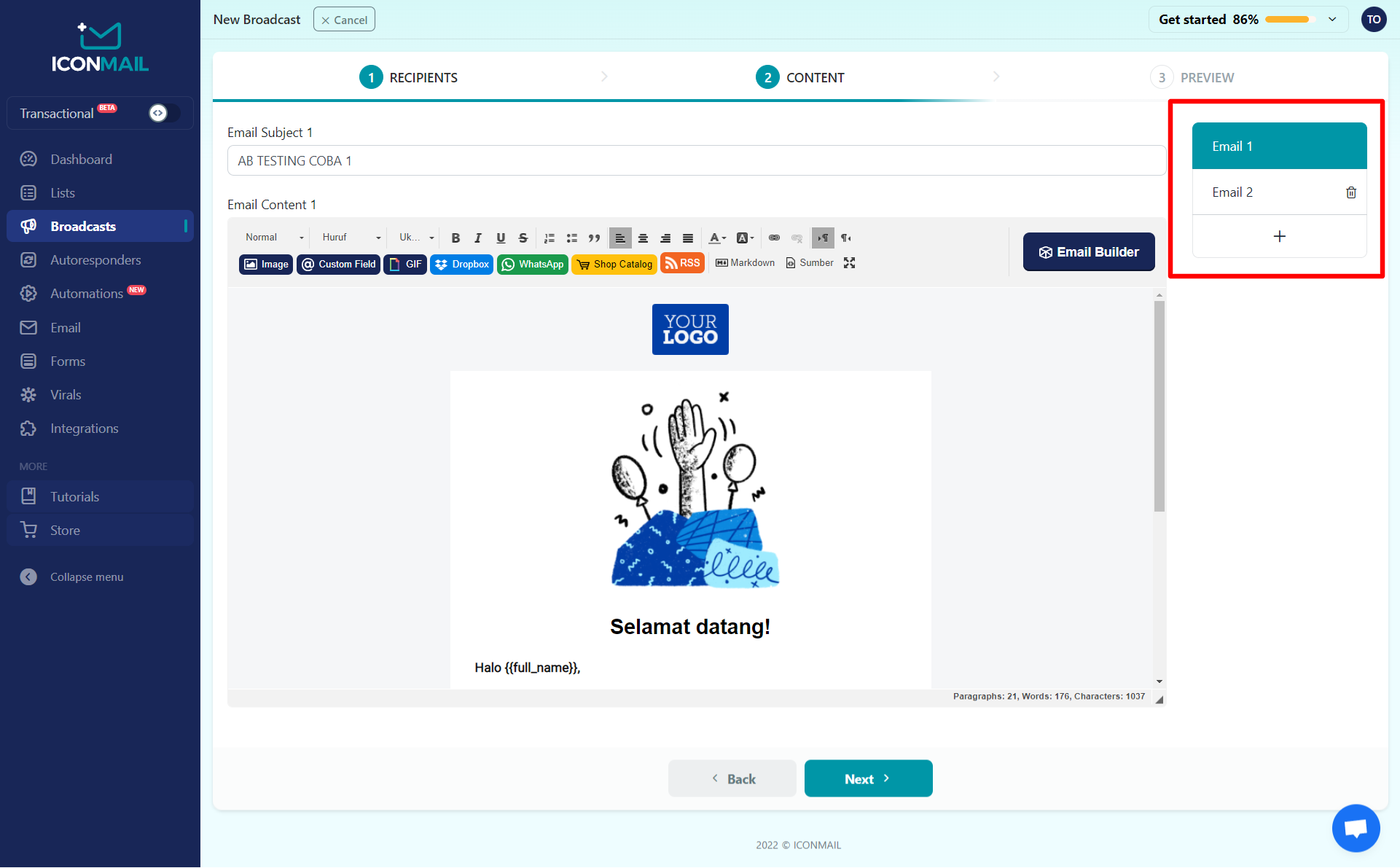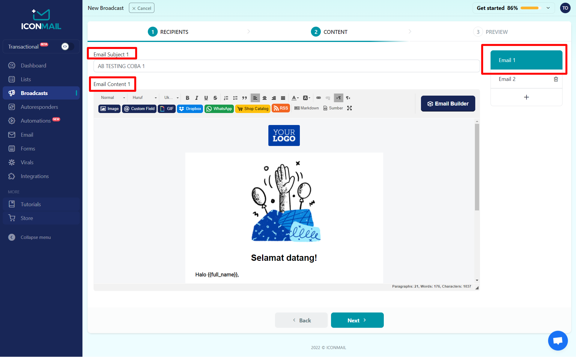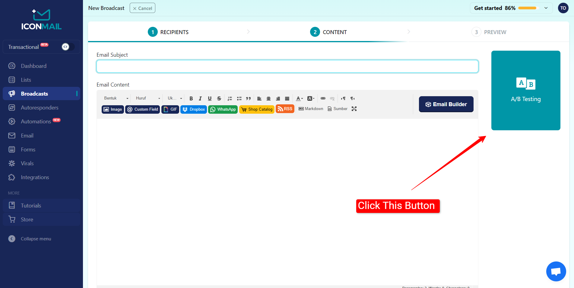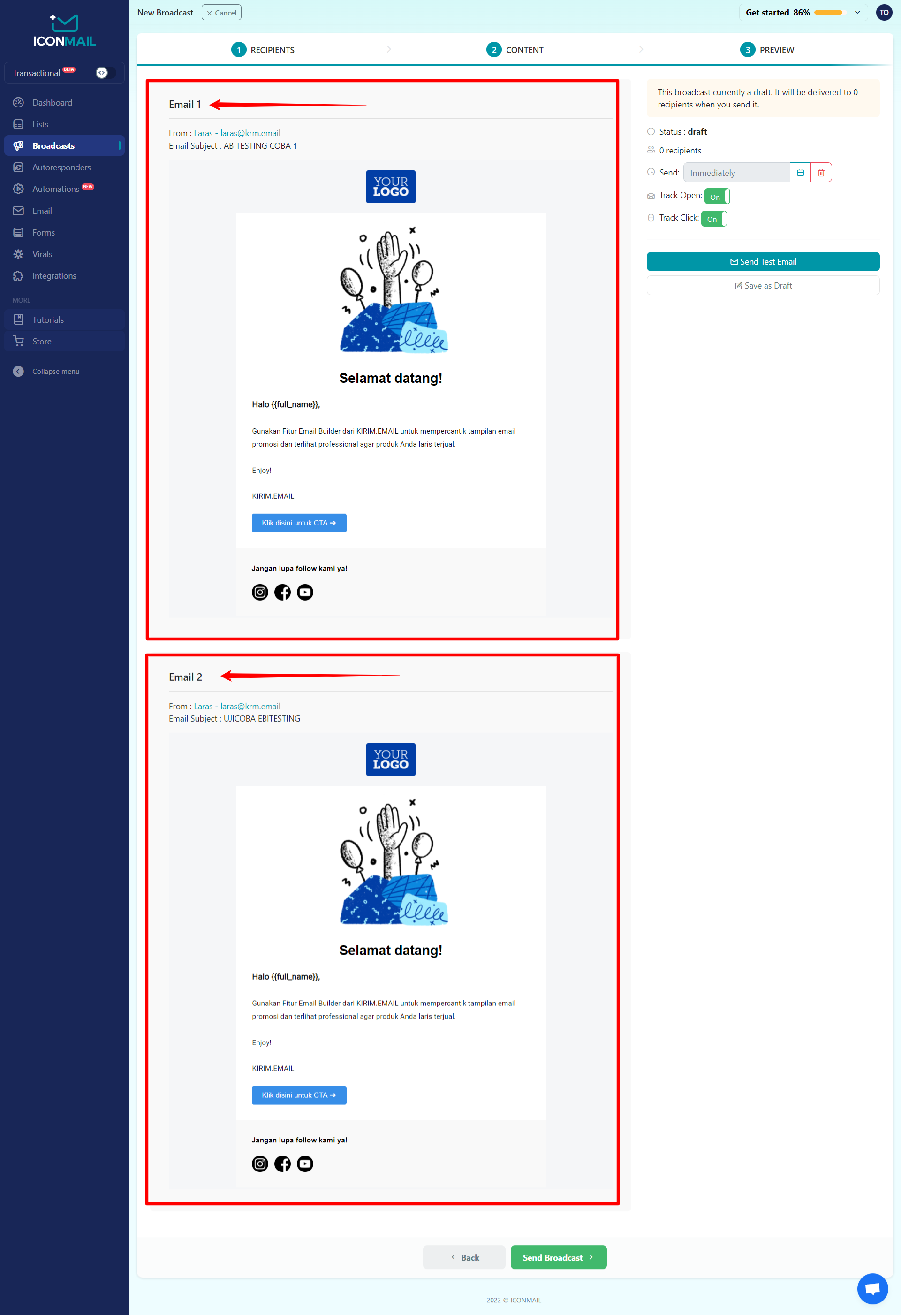 Anda bisa melakukan split testing atau A/B testing di ICONMAIL silakan ikuti langkah-langkah berikut ini :