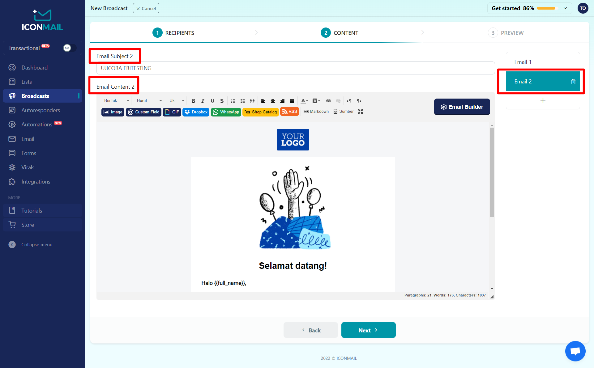 Sedangkan jika klik tab 2 maka maka fieldnya akan berubah menjadi Email Subject 2 dan Email Content 2.