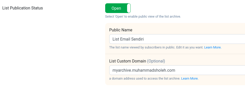 - List Custom Domain (Optional) : Tulis domain untuk mengakses list archive menggunakan domain Anda sendiri. Untuk cara pengaturannya silakan pelajari di sini.