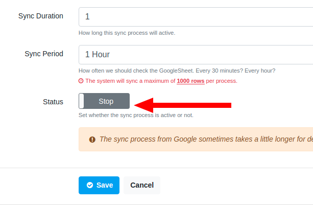 Untuk ciri yang pertama kemungkinan penyebabnya adalah waktu proses integrasi. Pada integrasi ini sistem membatasi maksimal 1000 baris per proses. Konsekuensinya, semakin besar jumlah baris di dalam Google Sheets, maka akan membutuhkan waktu yang semakin lama untuk memprosesnya.