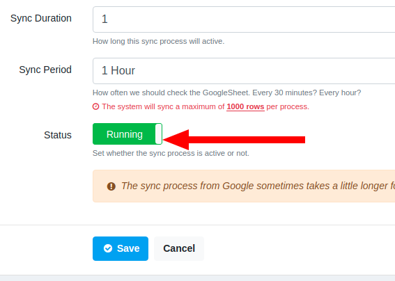 Jika yang tampil adalah tombol Stop, Anda lupa mengubahnya ke Running dan langsung klik tombol Save, maka yang akan terjadi adalah integrasi gagal dan jumlah kontak Anda tidak bertambah.