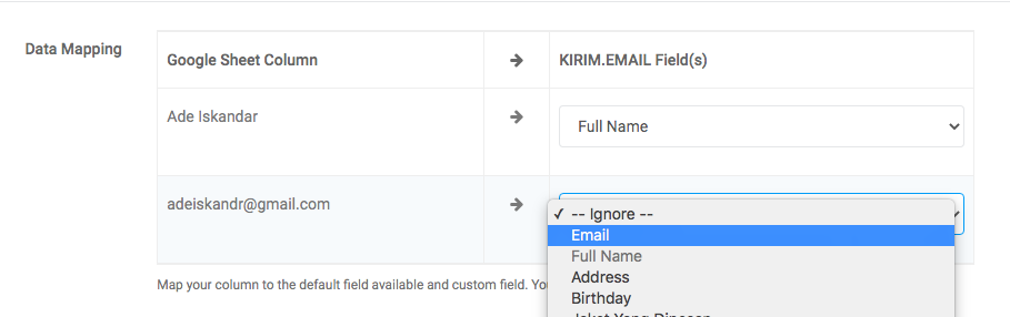 Silakan lakukan pengaturan di setiap field seperti berikut ini :- Google Account. Pada field ini klik tombol Select, lalu pilih akun Google Anda dan izinkan ICONMAIL mengakses Google Sheet Anda.