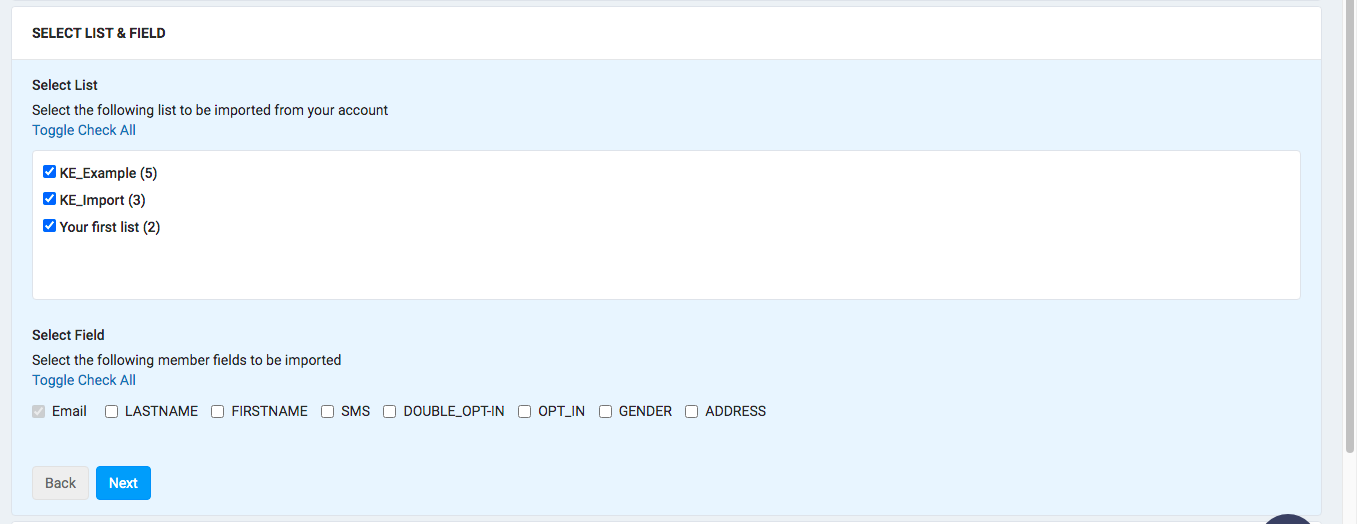 6. Pada bagian SELECT LIST & FIELD, pilih list dan data apa saja yang ingin Anda import. Caranya, berikan centang pada list dan data yang ingin Anda import, lalu klik tombol Next.