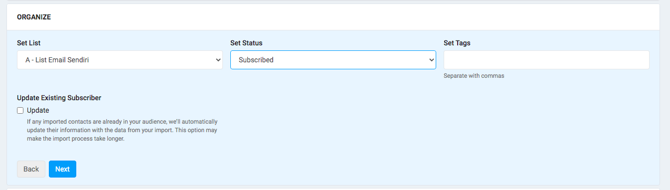 • Berikan centang pada Update Existing Subscriber, jika Anda ingin memperbarui data kontak yang sama di list tersebut.