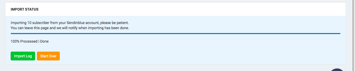 9. Terakhir adalah bagianĀ IMPORT STATUS. Di sini Anda bisa melihat perkembangan proses import kontak dari Sendinblue ke ICONMAIL. Anda bisa keluar dari halaman ini dan tidak perlu menunggu. Jika proses importnya sudah selesai maka sistem akan memberitahukan kepada Anda bahwa import sudah selesai.