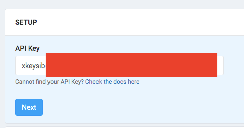 5. Pada bagian SETUP, Masukkan API Key dari akun Sendinblue Anda. Untuk cara mendapatkannya silakan klik di sini. Setelah itu klik tombol NEXT.
