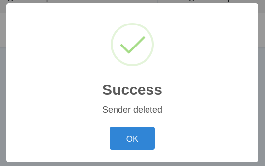 - Klik tombol OK pada notifikasi sukses email sender Anda sudah berhasil dihapus.